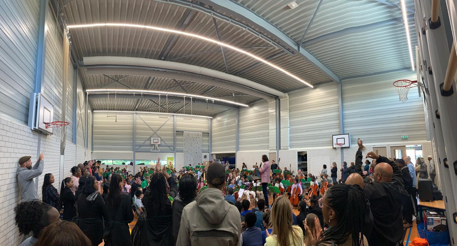 In een bomvolle gymzaal speelden donderdag 130 leerlingen, 20 docenten en 1 dirigent van alle groepen 5 van de basisscholen Samenspel en Wereldwijs als één groot Leerorkest.