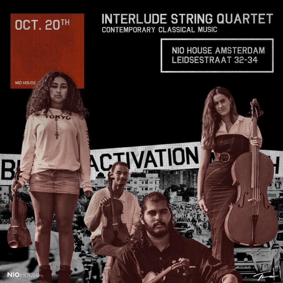 Interlude String Quartet is een strijkkwartet met moderne twist uit Amsterdam-Zuidoost. De vier leden begonnen ooit bij het Leerorkest en zijn uitgegroeid tot een voorloper van klassieke muziek uit de Bijlmer. Na een intro van Avi Kishna van het Leerorkest treedt het kwartet op en gooit alle remmen los in NIO House!