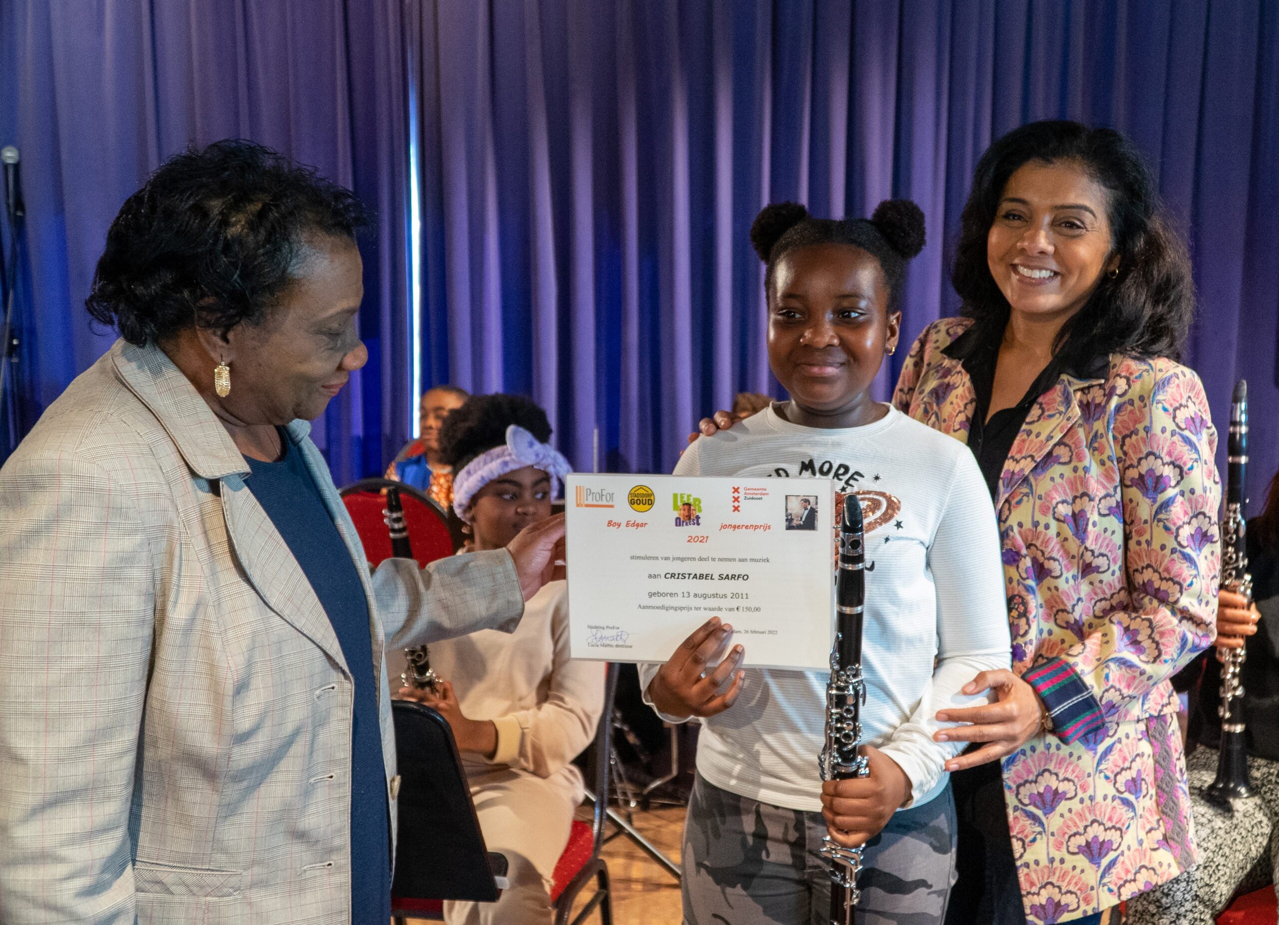 Tanja Jadnanansing, de Stadsdeelvoorzitter van Amsterdam Zuidoost heeft de eer deze prestigieuze Boy Edgar jongerenprijs te overhandigen aan een gedreven en zeer getalenteerde leerling van een van de Wijktalentorkesten in Zuidoost.